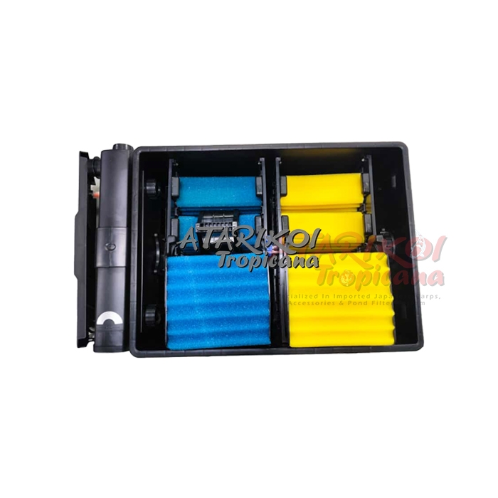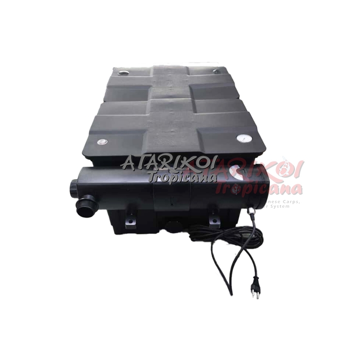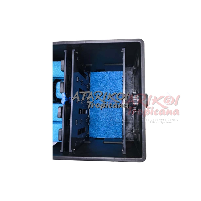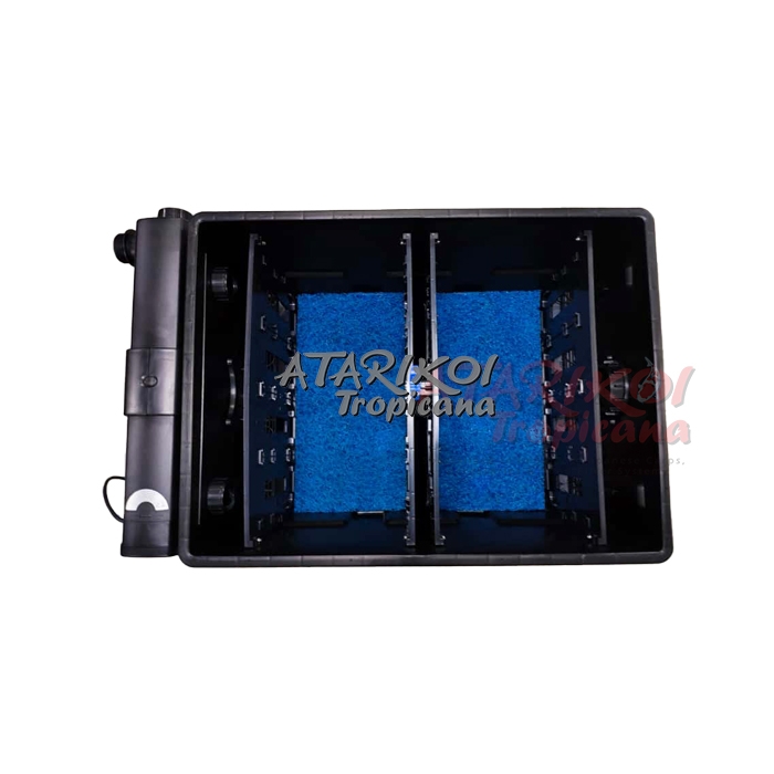 With a pond filter capacity of approx. 120 litre, distributed throughout 2 chambers, it ensures a reliable of the water with minimum effort. The Filter is equipped with 4 coarse filter, 4 fine filters and 2 Japan-filter mats.