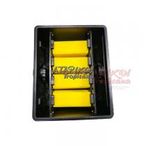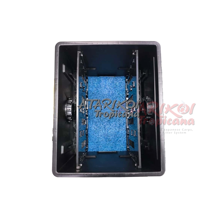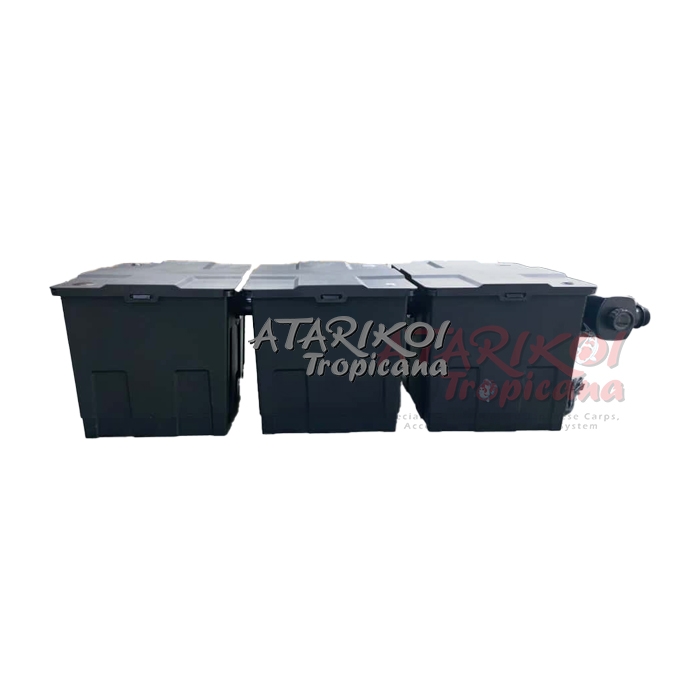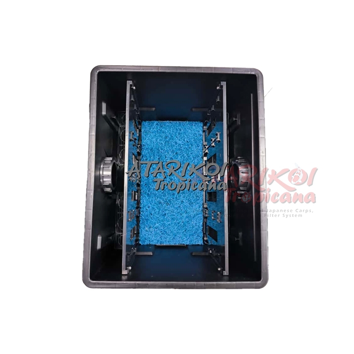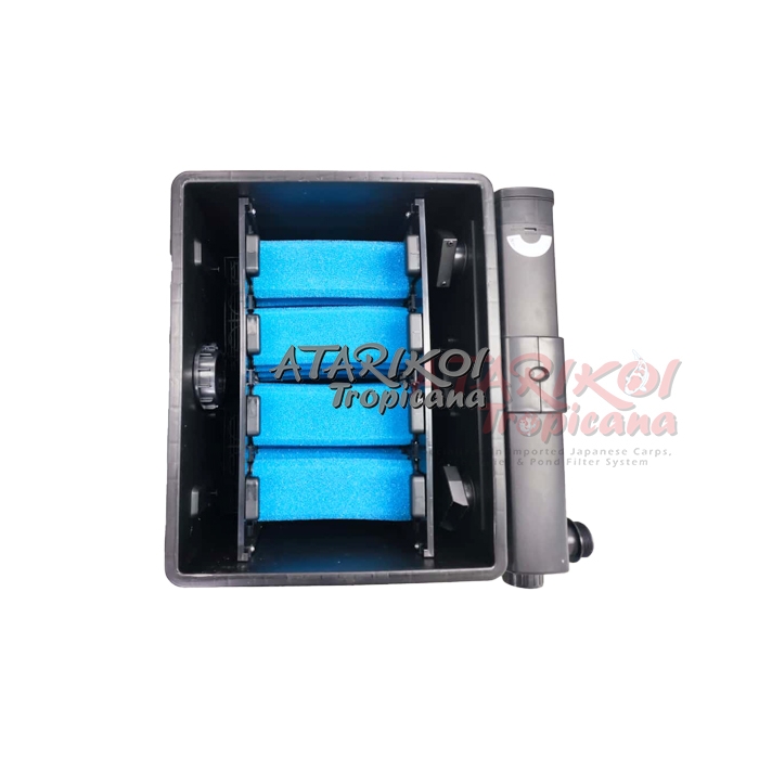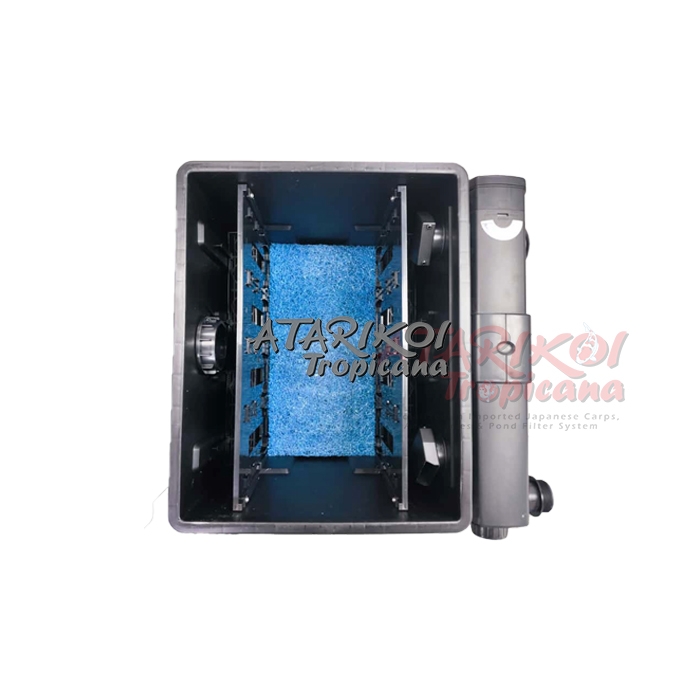 With a pond filter capacity of approx. 180 litre, distributed throughout 3 chambers, it ensures a reliable of the water with minimum effort. The Filter is equipped with 8 coarse filter, 4 fine filters and 3 Japan-filter mats.